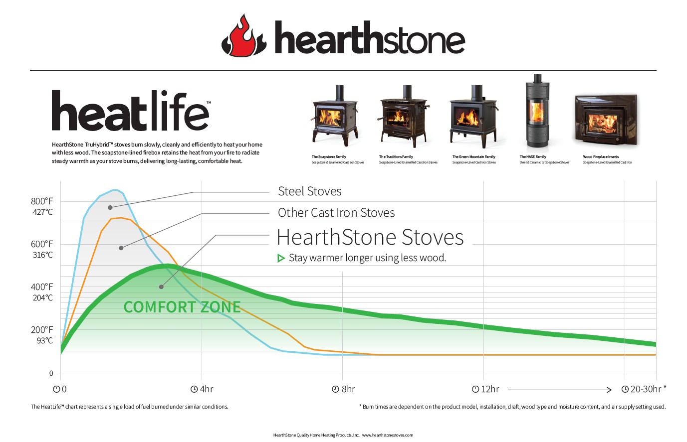 All of Hearthstones wood stoves are built using soapstone. Soapstone is a natural material that absorbs the sharp heat of the fire, stores the energy, then radiates a gentle heat back into the living space. This means your home stays at a comfortable temperature all day long.